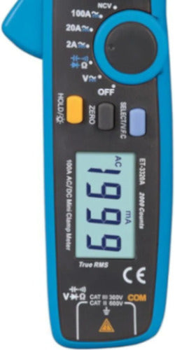 Alicate amperímetro digital ET-3320A Minipa Dimensões (C x L x A): 4 x 6 x 18 centímetros Peso: 0.17 Kg Alicates de bolso que une precisão e medidas essenciais, além de manuseio e transporte facilitados. Este modelo é ideal para medições de baixa corrente possuindo maior resolução em faixas menores. Especificações Técnicas: Display LCD/Contagem: 3 1/2 Dígitos/2000 Iluminação: sim True RMS: True RMS AC Corrente DC: 2/20/100A Corrente AC: 2/20/100A Tensão DC: 200m/2/20/200/600V Tensão AC: 2/20/200/600V Resistência: 200/2k/20k/200k/2M/20M? Teste de Continuidade/Diodo: sim Capacitância: 2nF/20nF/200nF/2?F/20?F/200?F/2mF/20mF Resolução em Corrente: 0,001/0,01/0,1A Data Hold: sim Detecção de Tensão Sem Contato (NCV): sim Mudança de Faixa: manual Abertura de Garra: 17mm Diâmetro do Condutor: 17mm Precisão Básica: 0,7% Categoria de Segurança: CAT III 300V Alimentação: 2 x1,5 AAA