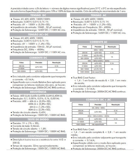 APLICAÇÕES Esse equipamento é projetado para ser aplicado ao redor ou removido de condutores perigosos não isolados. Mas ainda assim, deve-se usar equipamento de proteção individual se as partes perigosas sob tensão na instalação onde a medição deve ser realizada puderem ser acessíveis. SEGURANÇA Este instrumento está de acordo com a norma IEC61010-1 Categoria III 1500V / Categoria IV 1000V e dupla isolação. Como determinado pela norma de segurança NR-10, utilize sempre equipamentos de proteção individual. Sempre leia as informações de segurança e regras para operação segura contidas no manual de instruções. GERAL A precisão é dada como (% da leitura + número de dígitos menos significativos) para 31C 5C se não especificado de outra forma. Especificação válida para 10% a 100% da faixa de medida. Ciclo de calibração recomendado de 1 ano. CARACTERÍSTICAS Display: 3-5/6 dígitos 6000 contagens & 3-1/2 dígitos 1.999 contagens para Hz; True RMS AC+DC; Polaridade: Automático; Indicação de Bateria Fraca: O símbolo será exibido; Mudança de Faixa: Automática/ Manual; Taxa de atualização: 5 por segundo nominal; Luz de Fundo; Função APO: aproximadamente 34 minutos; Consumo APO: 10A; Abertura da garra e diâmetro do condutor: 55mm max; Modo de captura CREST-MAX de 5ms; Função Data Hold; Modo Relativo-Zero; Detecção de Tensão Sem Contato (NCV); Identificação de Linha Viva (Live); Temperatura de operação: 0C a 40C; Umidade relativa: Umidade relativa máxima 80% para temperatura até 31C, diminuindo linearmente até 50% de umidade relativa a 40C; Temperatura de armazenamento: -20C a 60C, < 80% R.H. (com a bateria removida); Alimentação: 2 pilhas alcalinas de 1,5V AA; Altitude de Operação: até 2000 metros; Segurança/Conformidade: de acordo com a IEC/ EN/BSEN/CSA_C22.2_No./UL do 61010-1 Ed. 3.1 & 61010-2-032 Ed. 4.0 às categorias de medição CAT IV 1000V AC & DC / CAT III 1500V. Dimensão: 264(A) X 97(L) X 43(P)mm; Peso: 608 gramas; ACESSÓRIOS Pontas de Prova (1 par); Bolsa de transporte(1 un.); Termopar tipo K (1 un.). TENSÃO DC Faixas: 6V, 60V, 600V, 1000V, 1500V; Resolução: 0,001V, 0,01V, 0,1V, 1V; Precisão: 6V ~ 1500V (0,5%+5D); Impedância de entrada: 10Mohm , 50 pF nominal; Proteção de Sobrecarga: 1650V DC / 1100V AC rms. TENSÃO AC Faixas: 6V, 60V, 600V, 1000V; Resolução: 0,001V, 0,01V, 0,1V, 1V; Precisão: 6V ~ 1000V (1,2%+5D); Resposta em Frequência: 50~ 400Hz Impedância de entrada: 10M ohm , 50 pF nominal; Proteção de Sobrecarga: 1650V DC / 1100V AC rms. TENSÃO AC+DC Faixas: 6V, 60V, 600V, 1000V; Resolução: 0,001V, 0,01V, 0,1V, 1V; Precisão: 6V ~ 1000V (1,4%+7D); Impedância de entrada: 10M W , 50 pF nominal; Frequência DC, 50Hz ~ 400Hz; Proteção de Sobrecarga: 1650V DC / 1100V AC rms. CORRENTE DC Erro induzido pelo condutor adjacente que transporta a corrente: < 0.1A/A; Especificado com o modo Relative Zero aplicado para compensar as leituras residuais não-zero, se houver; Proteção de Sobrecarga: 2000A DC/AC RMS contínuo. CORRENTE AC True RMS Crest Factor: < 1,4 : 1 em fundo de escala & < 2,8: 1 em meio de escala; Erro induzido pelo condutor adjacente que transporta a corrente: < 0.1A/A; Proteção de Sobrecarga: 2000A DC/AC RMS contínuo. RESISTÊNCIA Faixas: 600 W, 6k W, 60k W, 600k W, 6M W, 40M W; Resolução: 0,1, 0,001k, 0,01k, 0,1k, 0,001M; Precisão: 600 ~ 60k W (0,5%+5D); 600k W (0,8%+5D); 6M W (1,2%+5D); 40M W (2,3%+5D); Tensão de circuito aberto: 0,45V; Proteção de Sobrecarga: 1500V DC / 1000V AC RMS. CORRENTE DC + AC True RMS Fator Crest: < 1,4 : 1 em escala completa & < 2,8 : 1 em escala média; Erro induzido pelo condutor adjacente que transporta a corrente: < 0.1A/A; Especificação válida com o modo Zero aplicado para compensar as leituras residuais, se houver; Proteção de Sobrecarga: 2000A DC/AC RMS contínuo. TESTE DE DIODO Precisão: 1V (1% + 3D); Corrente de teste: 0,56mA; Tensão de circuito aberto: < 1,8V; Proteção de Sobrecarga: 1500V DC / 1000V AC RMS. CONTINUIDADE Descrição: A buzina toca se a resistência for entre 10 ohm e 200 ohm; Tempo de resposta: 32ms aproximadamente; Proteção de Sobrecarga: 1500V DC / 1000V AC RMS. CAPACITÂNCIA Faixas: 60nF, 600nF, 6F, 60F, 600F, 2000F; Resolução: 0,01nF, 0,1nF, 0,001F, 0,01F, 0,1F, 1F; Precisão: 60nF~6F (2%+5D); 60F~600F (3,5%+5D); 2000F (4%+5D); Precisões com capacitor de filme ou melhor; Coeficiente de temperatura: 0,25 x (precisão especificada)/ C @(0C -- 18C ou 28C -- 40C); Proteção de Sobrecarga: 1500V DC / 1000V AC RMS. DETECÇÃO DE TENSÃO SEM CONTATO (NCV) Indicação: Segmentos de gráfico de barras e sons sonoros proporcionais à força do campo; Frequência de detecção: 50/60Hz; Antena de detecção: Parte superior da mandíbula estacionária; Proteção de Sobrecarga: 1500V DC / 1000V AC RMS. VFD AC (com filtro passa-baixo) Não especificado para frequência fundamental > 400Hz; A precisão diminui linearmente de 2% + 60D @ 200Hz para 7% + 80D @ 400Hz; Modo de captura CREST-MAX; Precisão: Precisão especificada mais 250 dígitos para alterações > 5ms de duração; Proteção de Sobrecarga: 1650V DC / 1100V AC RMS. TEMPERATURA Faixas: -50C ~ 1000C; -58F ~ 1832F; Precisão: -40 ~ 1000C (0,3% + 4C); -58 ~ 1832F (0,3% + 6F); Faixa de termopares tipo K e precisão não incluídas Proteção de Sobrecarga: 1500V DC / 1000V AC RMS. FREQUÊNCIA DE REDE Precisão: (0,1%+4D); A sensibilidade VFD decresce linearmente de 10% F.S. @ 200Hz para 40% F.S. @ 400Hz; Se houver offset DC, não mais de 50% de Sine RMS; Se houver offset DC, não mais de 100V. Proteção de Sobrecarga: 1650V DC / 1100V AC RMS; 2000A DC/AC RMS contínuo.