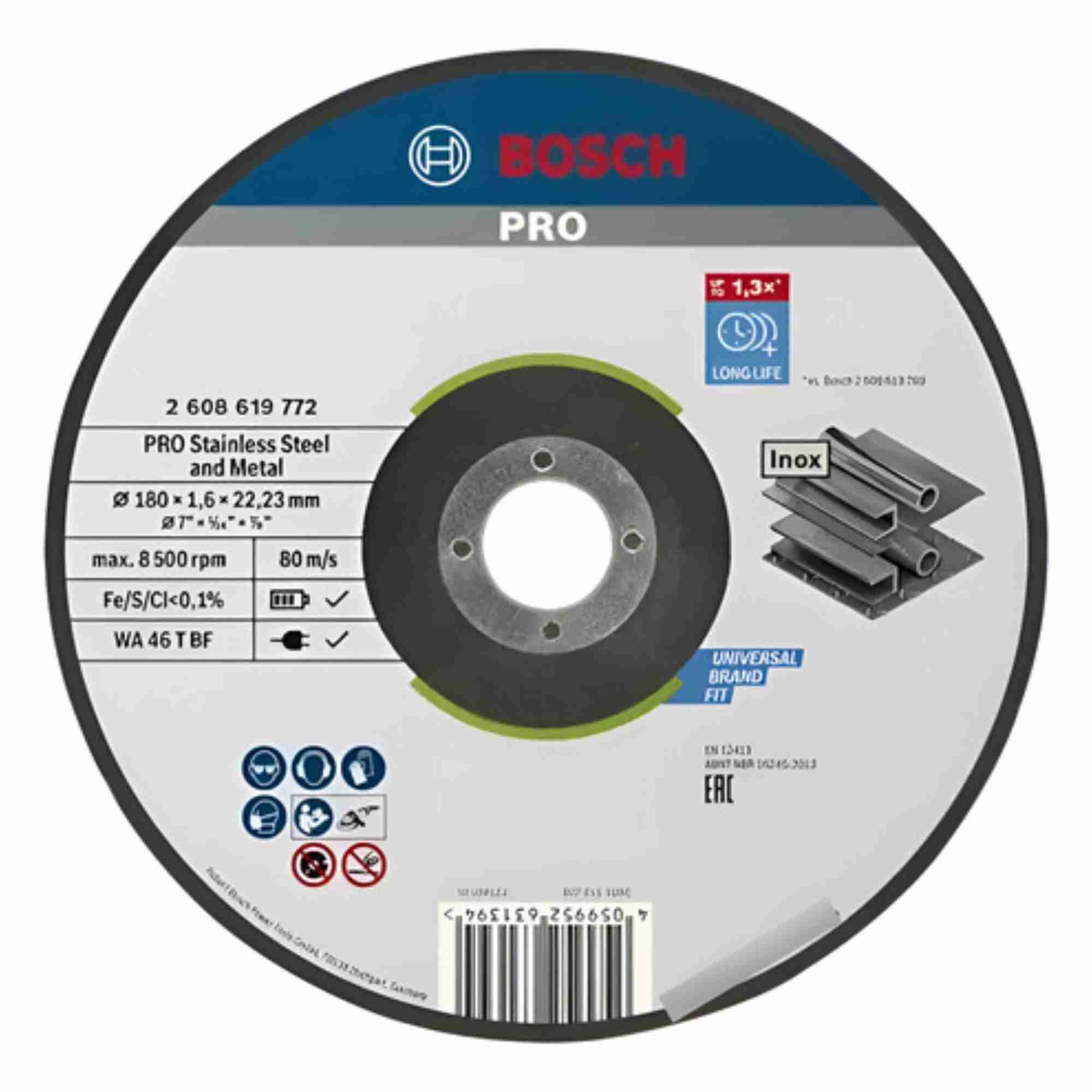 O Disco de corte abrasivo PRO Stainless Steel and Metal BOSCH, usa grãos de óxido de alumínio premium para resistência e durabilidade;