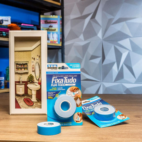 Fita de fixação ultraforte para você produzir scrapbooks, scrapdecor/arte francesa. Cole o que mais sua imaginação mandar, dentro ou fora de casa. A Fita Dupla Face Fixa Tudo Espuma – Uso Externo e Interno da Tekbond é a queridinha de quem faz artesanatos. Isso porque a sua espuma faz as partes coladas “saltarem” aos olhos, em alto relevo. Com esse diferencial você fará incríveis álbuns de recorte (scrapbook), caixas decorativas, molduras e outros tipos de objetos (scrapdecor/arte francesa). Além de todo esse potencial para o artesanato, ela também é perfeita para quem prefere evitar o uso de pregos, parafusos ou colas. Além da fixação ultraforte, ela ainda é resistente à ação dos raios UV, chuva e condições climáticas extremas. E o melhor: sem danificar as superfícies! Fixe quadros, espelhos, objetos decorativos, canaletas e o que mais você precisar. Funciona perfeitamente em papel, madeira, parede, vidro, acrílico e metal. A fita ideal, tanto para artesanatos como para utilidades domésticas!