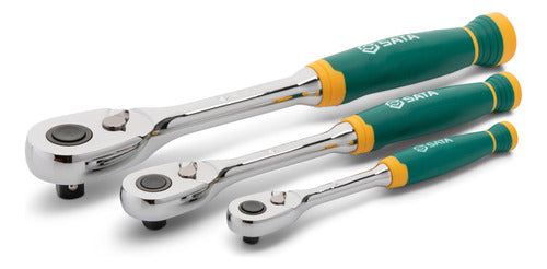 Jogo de Catracas com Cabo 1/2" 1/4" 3/8” 72 dentes 3 peças SATA - ST14901G Sobre o produto: O Jogo de Catracas com Cabo 1/2" 1/4" 3/8” 72 dentes 3 peças SATA - ST14901G conta com as principais medidas de catracas, sendo essencial para profissionais, oficinas mecânicas e industriais que buscam agilidade e ergonomia, e não abrem mão da durabilidade e resistência. As catracas possuem 72 dentes que oferecem a vantagem de apertar/soltar o parafuso ou porca com apenas 5 graus de área livre, sem ser necessário a retirada da chave cada vez que houver um obstáculo durante a operação. Aliado ao seu Design Slim, se tornam ferramentas indispensáveis para oficinas que realizam manutenções em locais de difícil acesso. Fabricadas em Cr-V, as Catracas SATA são resistentes, duráveis e ideais para uso intenso. Seu acabamento cromado previne ferrugem, unindo funcionalidade e elegância. Benefícios e Características: Durabilidade e Resistência: Liga de aço cromo vanádio (Cr-V) para resistência e durabilidade excepcionais. Acabamento cromado e totalmente polido facilitando a limpeza de resíduos e promovendo resistência à corrosões. Cabo resistente a óleo e solvente que proporciona maior vida útil da ferramenta. Produtividade e Agilidade: Alavanca reversível embutida, permitindo a alteração do sentido de aperto sem a necessidade de remover a chave. Sistema Quick-Release com botão de liberação rápida para fácil remoção e troca do soquete. Acessibilidade: Possui 72 dentes e precisa de apenas um giro de 5° para girar um fixador, sendo ideal para espaços estreitos. Design Slim que permite o melhor acesso em espaços apertados. Ergonomia: Cabo com material duplo para uma pegada mais confortável e ergonômica. Garantia: Garantia Vitalícia SATA* contra defeitos de fabricação. Itens Inclusos: 1- Jogo de Catracas com Cabo 1/2" 1/4" 3/8” 72 dentes 3 peças SATA - ST14901G Contendo: 1- Catraca com cabo 3/8" 72 dentes SATA - ST12971G 1- Catraca com cabo 1/4" 72 dentes SATA - ST11971G 1- Catraca com cabo 1/2" 72 dentes SATA - ST13971G
