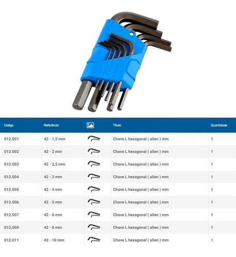 • Aço Gedore Vanádio. • Fosfatizada, escurecida. • Chave para parafuso com sextavado interno. • Medidas: 1,5, 2, 2,5, 3, 4, 5, 6, 8, 10MM