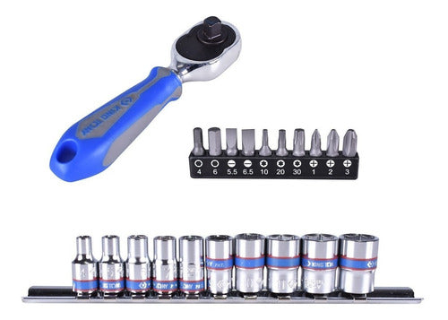 Jogo de catraca reversível com bits e soquetes é composto por 21 peças fabricadas em aço resistente, proporcionando maior resistência à corrosão e durabilidade. Indicado para utilização em ferramentas manuais. Contém 01 mini catraca, 10 bits e 10 soquetes de tamanhos variados, oferecendo praticidade e eficiência durante o trabalho. - Jogo composto por: :: 01 mini catraca reversível de 1/4" # Fabricada em aço cromo-vanádio # Conta com mecanismo interno fabricado em aço cromo-molibdênio com acabamento fosfatizado # Acabamento cromado e polido # Engrenagem de 32 dentes acionada a 11º # Possui mecanismo de reversão # Produzida de acordo com a norma DIN 3122