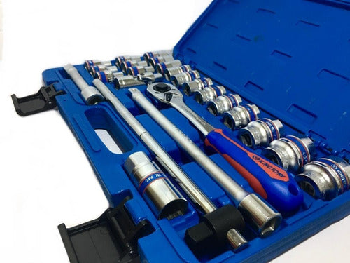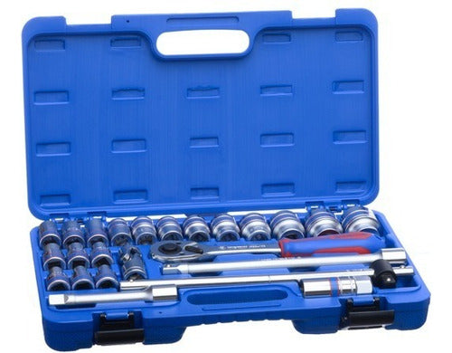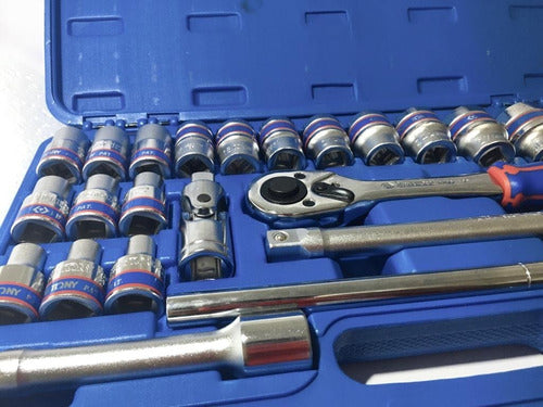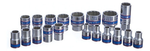 Jogo De Soquete Estriado com 24 PÇS - 1/2"- ST4028MR Características técnicas: Jogo de soquete estriado com 24 peças - 1/2" Fabricado em aço cromo-vanádio Acabamento cromado e polido King Tony Fix-Drive perfil arredondado para maior torque Composição: 4330MR: 8, 9, 10, 11, 12, 13, 14, 15, 16, 17, 18, 19, 21, 22, 24, 27, 30, 32mm 4251-05R / 4251-10R - Extensão 5" e 10" de 1/2" 4572 - Cabo de força "T" 300mm 463021R - Soquete de vela de 20.8mm 4766-10G - Catraca reversível 10" 4791R - Junta Universal Aplicações e Segurança: Produzido de acordo com as normas DIN 3124, ISO 2725-1