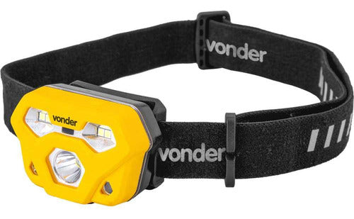 Uma lanterna de cabeça recarregável da marca Vonder (modelo LCV 400) que oferece iluminação potente (até ~400 lúmens), funciona com bateria interna 3,7 V / 1.500 mAh, tem faixa elástica ajustável para fixar na cabeça ou capacete, entrada USB-C para recarga e é resistente a quedas e respingos de água.