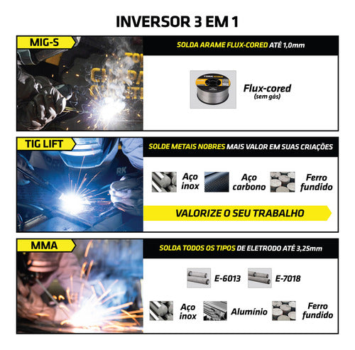 Produto combinado 3X1, a fonte de solda tem a capacidade de realizar 3 processos de soldagem como MIG SEM GÁS, TIG-LIFT e MMA.