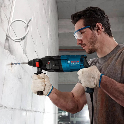 Oferece maior produtividade aos profissionais em perfurações de concreto, na construção ou reformas em geral. Confira! O Martelete Perfurador Rompedor de Impacto SDS Plus Bosch GBH 2-24 D é uma ferramenta elétrica usada em trabalhos de construção e demolição. Ele é projetado para perfurar e quebrar superfícies resistentes, como concreto, alvenaria e pedra. Equipado com um sistema SDS Plus, que permite a troca rápida e fácil de brocas e ponteiras sem a necessidade de chaves ou outros acessórios. Indicado para projetos de construção de grande escala, como construção de pontes, estradas e edifícios. Eles também são úteis em trabalhos de renovação, como a remoção de azulejos antigos ou concreto. Essencial para trabalhos de construção e demolição que exigem a quebra de superfícies resistentes. - Características: :: Com Impacto e Função Rompedor :: Modo de Operação: 3 Funções :: Velocidade variável :: Longa vida útil graças a componentes de motor de alta qualidade :: Vario-Lock para o ajuste dos cinzéis :: Embreagem de segurança contra sobrecarga e velocidade variável :: Sistema de ajuste da posição do cinzel e talhadeira :: Cabo giratório de 4 metros, evitando rompimento prematuro :: Punho emborrachado para melhor agarre e aplicação - Uso indicado / Aplicação em material: :: Perfurações Com e Sem Impacto :: Cinzelamentos - Para Profissionais: :: Pedreiros :: Instaladores de Móveis e Cortinas :: Empreiteiros :: Eletricistas :: Encanadores :: Instaladores de Ar Condicionado :: Instaladores de Tela de Proteção :: Instaladores de Portões - Especificações Técnicas: :: Tensão: 220V :: Potência: 820W :: Mandril: 1/2 Pol. - 13mm :: Tipo de Mandril / Sistema de encaixe: SDS plus :: Força de Impacto: 2.7J :: Nº de rotações (sem carga) rpm Mínimo e Máximo: 0-1.300 :: Diâmetro max. perfuração concreto: 24mm :: Diâmetro max. perfuração concreto broca maciça: 24mm :: Diâmetro max. perfuração madeira: 30mm :: Diâmetro max. perfuração aço: 13mm :: Impactos por minuto: 0-5.100 :: Vibração (m/s²) Perfuração: 17 / 13 m/s² :: Vibração (m/s²) Cinzelamento: 17 / 13 m/s² - Conteúdo da Embalagem: :: 1 Martelete Perfurador GBH 2-24 :: 1 Limitador de profundidade :: 1 Empunhadura Auxiliar :: 1 Maleta - Garantia: 2 anos