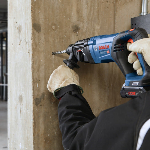 Martelete Perfurador à bateria 18V possui empunhadeira em D para aplicações verticais de perfuração e cinzelagem na categoria sem fio SDS plus. Energia de impacto de 2,5 J e motor sem escovas, que garante maior potência igual à potência com fio dos martelos tradicionais. Oferece um manuseio flexível e uma maior proteção do usuário. Manuseio confortável graças ao interruptor grande e empunhadeira em D, suportado por uma luz LED brilhante. - Acompanha: :: Empunhadeira adicional :: Batente de profundidade de 210 mm :: Pano de máquina - Especificações Técnicas: :: Voltagem da bateria: 18V :: Energia máx. de impacto: 2,5J :: Número máx. de impactos: 0 – 4.350 i.p.m. :: Nº de rotações nominais: 0 – 980 r.p.m. :: Peso sem bateria: 2,6kg :: Suporte da ferramenta: SDS plus :: Ø de perfuração em concreto com brocas para martelo: 4 – 26 mm :: Faixa apl. opc. em concreto com brocas para martelo: 8 – 16mm :: Ø máx. de perfuração em metal: 13mm :: Ø máx. de perfuração em madeira: 30mm :: Valor de emissão de vibrações ah: 15,5 m/s² :: Incerteza K: 2,5m/s² :: Nível de pressão sonora: 91,1 dB(A) :: Nível de potência sonora: 102,1 dB(A) :: Incerteza K: 3 dB Obs: Não acompanha bateria e carregador - Garantia: 2 anos Ref.: BOSCH-0611916001-000 Marca.: BOSCH *Imagens meramente ilustrativas *Todas as informações divulgadas são de responsabilidade do Fabricante/Fornecedor